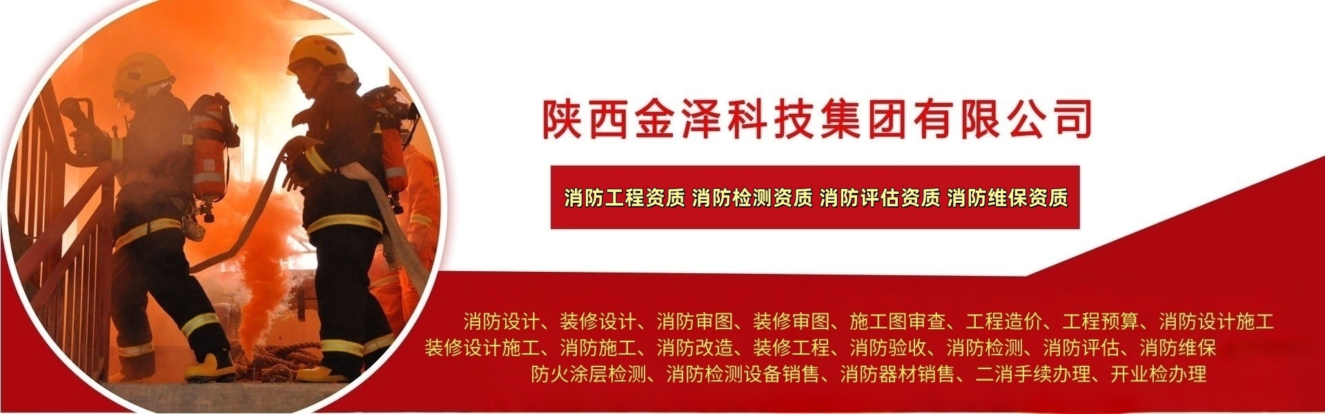 详情>>陕西金泽科技集团有限公司主营:消防设计、装修设计、消防审图、装修审图、施工图审查、工程造价、工程预算、消防设计施工、装修设计施工、消防施工、消防改造、装修工程、消防验收、消防检测、消防评估、消防维保、无损检测、防火涂层检测、消防检测设备销售、消防器材销售、二消手续办理、开业检办理。